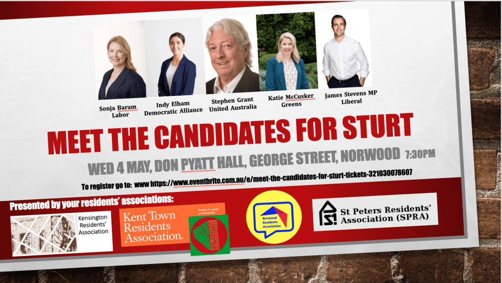| Forget all those leaflets in your letterbox, come to this free public forum to meet the candidates in person! Don’t miss this rare chance to hear from the candidates who want to represent you in the federal seat of Sturt. You’ll also be given a chance to ask questions about the issues you care about. Participating in the event will be Sonja Baram from the Labor party, Inty Elham from the Democratic Alliance, Stephen Grant from United Australia, Katie McCusker from the Greens and James Stevens MP from the Liberal party. Audience members will be invited to ask questions from the floor following a short presentation from each candidate. The forum is hosted by the volunteers of your local residents’ associations. They not only advocate for your community but hold many social and cultural events as well! New members are always welcome:Kensington Residents’ Association: https://www.kra.org.au Kent Town Residents’ Association: https://www.ktra.net Norwood Residents’ Association: https://norwoodresidentsassociation.com St Peters Residents’ Association: http://stpeters.asn.au Here are some useful details for the forum: The event is free but registrations are required due to limited seating. Free refreshments will be provided at the end of the forum. The Don Pyatt Hall is located behind the Norwood Town Hall, via the entrance of the Norwood Concert Hall on George Street. Free parking is available in the nearby Webb Street car park. The map and other info for the Sturt electorate can be found here: https://www.aec.gov.au/profiles/sa/sturt.htm Be quick to register as capacity is limited. Go to: https://www.eventbrite.com.au/e/meet-the-candidates-for-sturt-tickets-321030078607 |